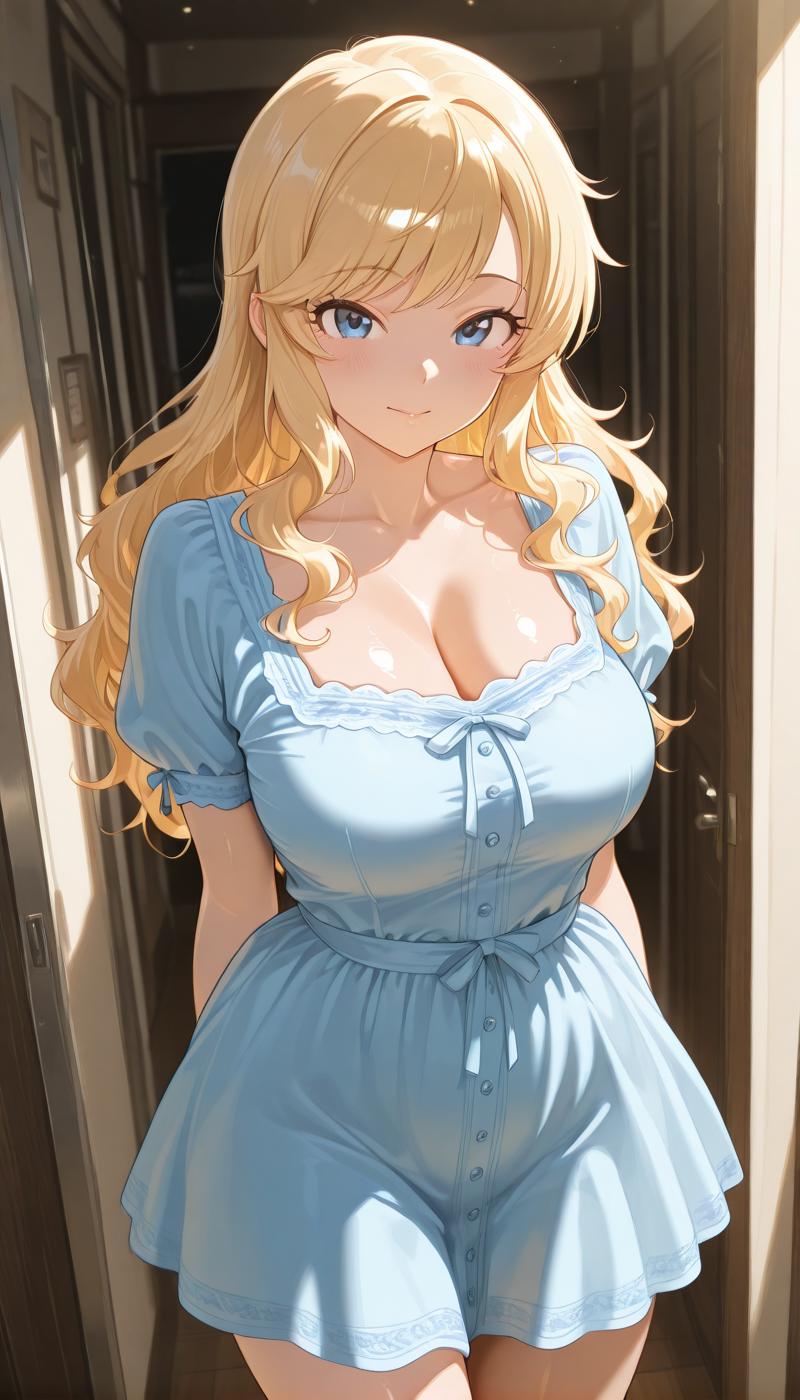 3.连衣裙,乳沟,锁骨,短袖,蓬松袖,蓬松短袖,浅蓝连衣裙,方领,大腿,