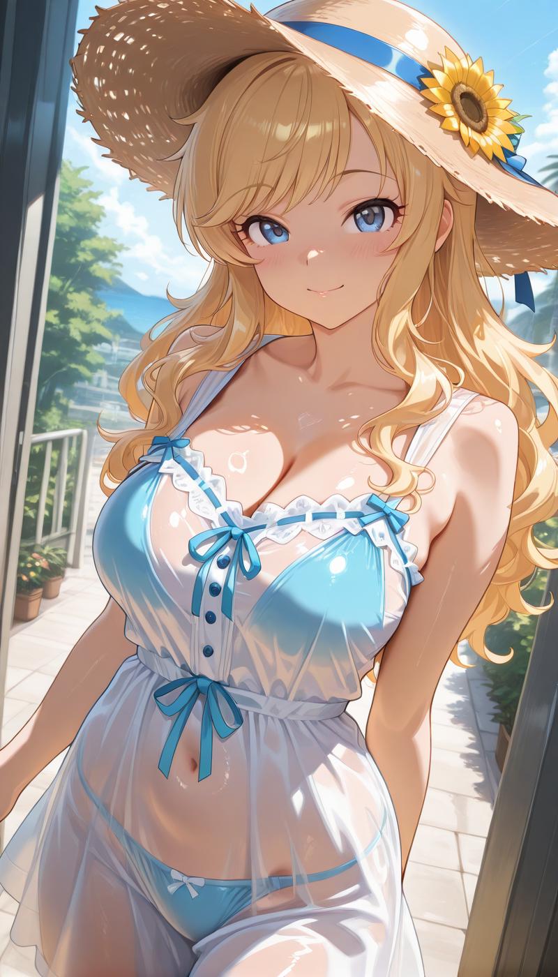 2.连衣裙,帽子,丝带,乳沟,露肩,锁骨,泳装,花朵,大腿,白连衣裙,透明,露臂,无袖连衣裙,蓝丝带,湿衣物,太阳帽,帽上花朵,草帽,向日葵,沙滩裙,透明连衣裙,湿连衣裙,肚脐,比基尼,白比基尼,蓝比基尼,棕色头饰,衣下比基尼