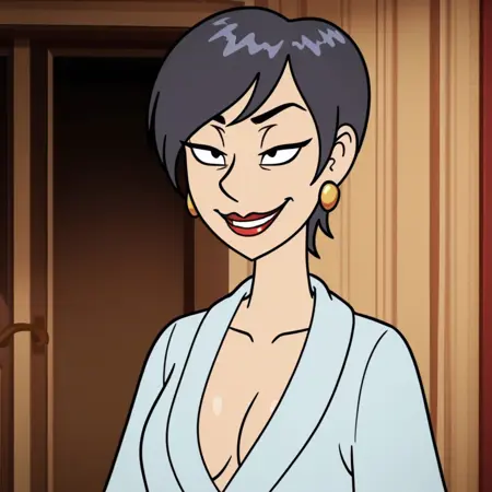 Barbara, 1girl, solo, short black hair, red lips, gold earrings