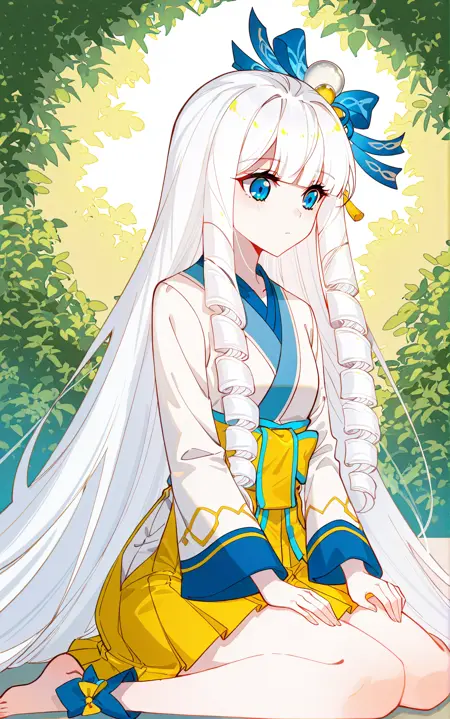 Xuedi2, 1 girl, solo, blue eyes, white hair, very long hair, thick sidelocks, spiral sidelocks, blunt bangs, blue eyes, fluffy hair, big hair bow, blue ribbon, golden accent, orb ornament, hair ornament, small girl, small stature,