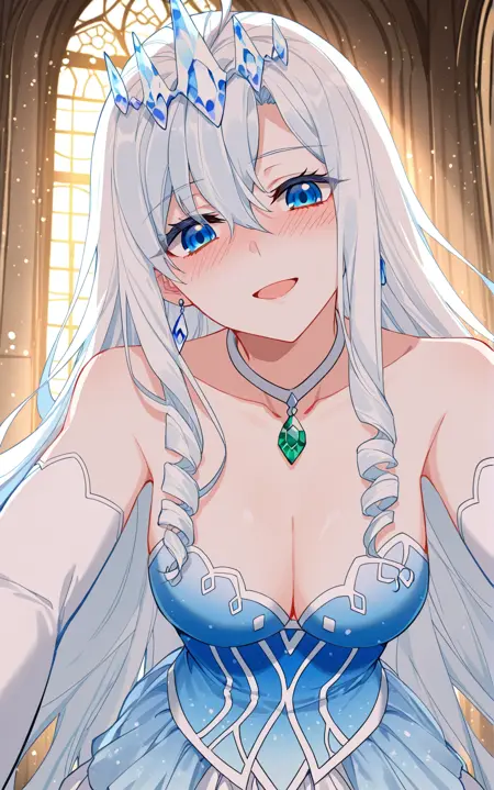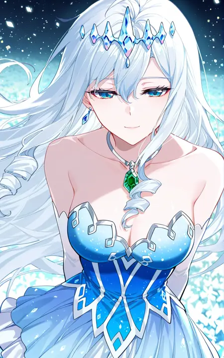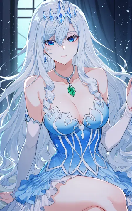 Xuedi1, 1 girl, solo, blue eyes, long hair, white hair, wavy hair, hair between eyes, curly side locks, thick sidelocks, crystal crown, icy tiara, gemstone necklace, emerald pendant, drop earrings,