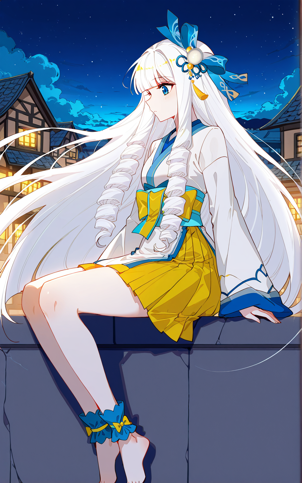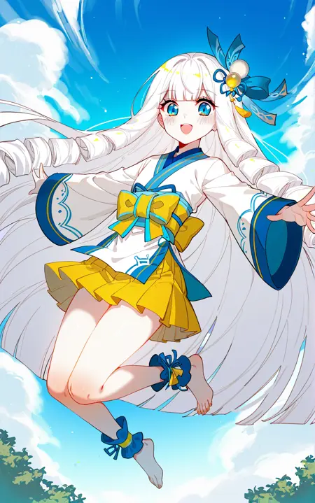 Xuedi2_outfit, white kimono-style outfit, blue collar, flared sleeves, blue and yellow trim, yellow pleated skirt, decorative front panel, central white cloth, yellow wide waist bow, barefoot, blue foot wraps, decorative ankle ribbons