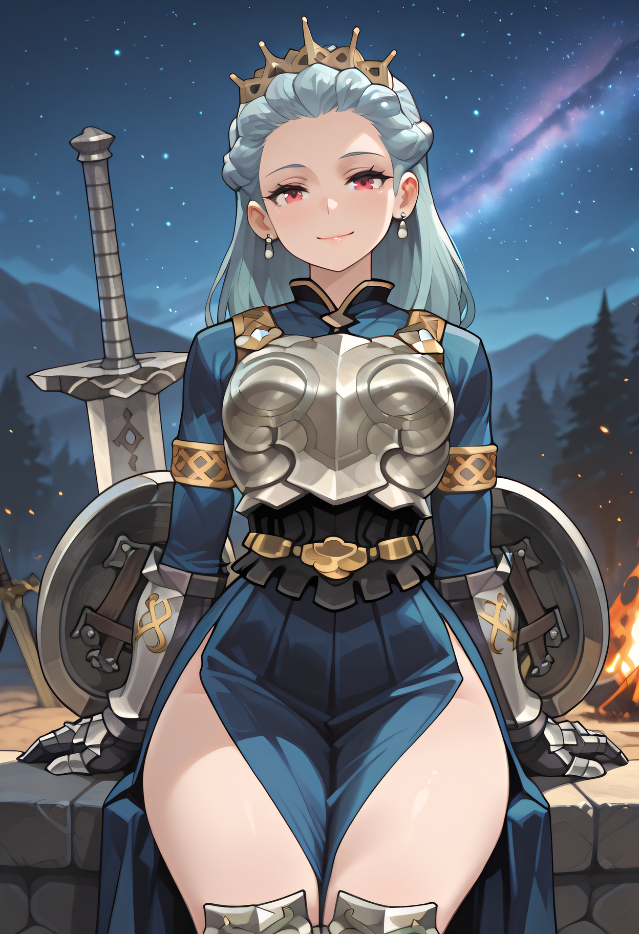 blue dress, gold accent, jewelry, armor, shoulder armor, pauldrons, blue dress, gauntlets, breastplate, armored boots, greaves, side slit, pelvic curtain,