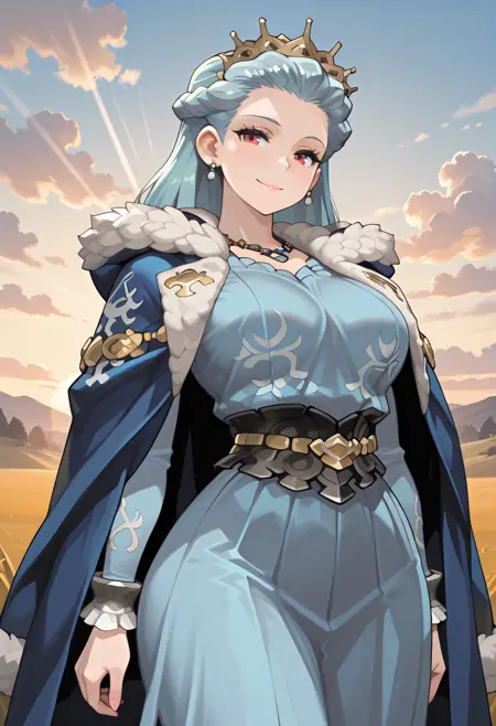 illenia (unicorn overlord), mature female, long hair, blue hair,hair slicked back, tiara, crown, red eyes, jewelry, earrings,