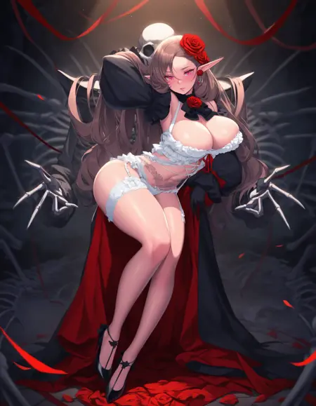 - 提示词:best quality,masterpiece,Laima,1girl,solo,pink eyes,elf ears,brown long hair,lips,large breasts,rose earrings,red rose hair accessory,