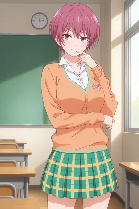 aatomo, 보라색 눈, 분홍색 머리, 단발, tomoschool, 학교 유니폼, 흰색 셔츠, 열린 칼라, 주황색 스웨터, 체크무늬 치마, 녹색 치마, 주름 치마, 애니메이션 채색,