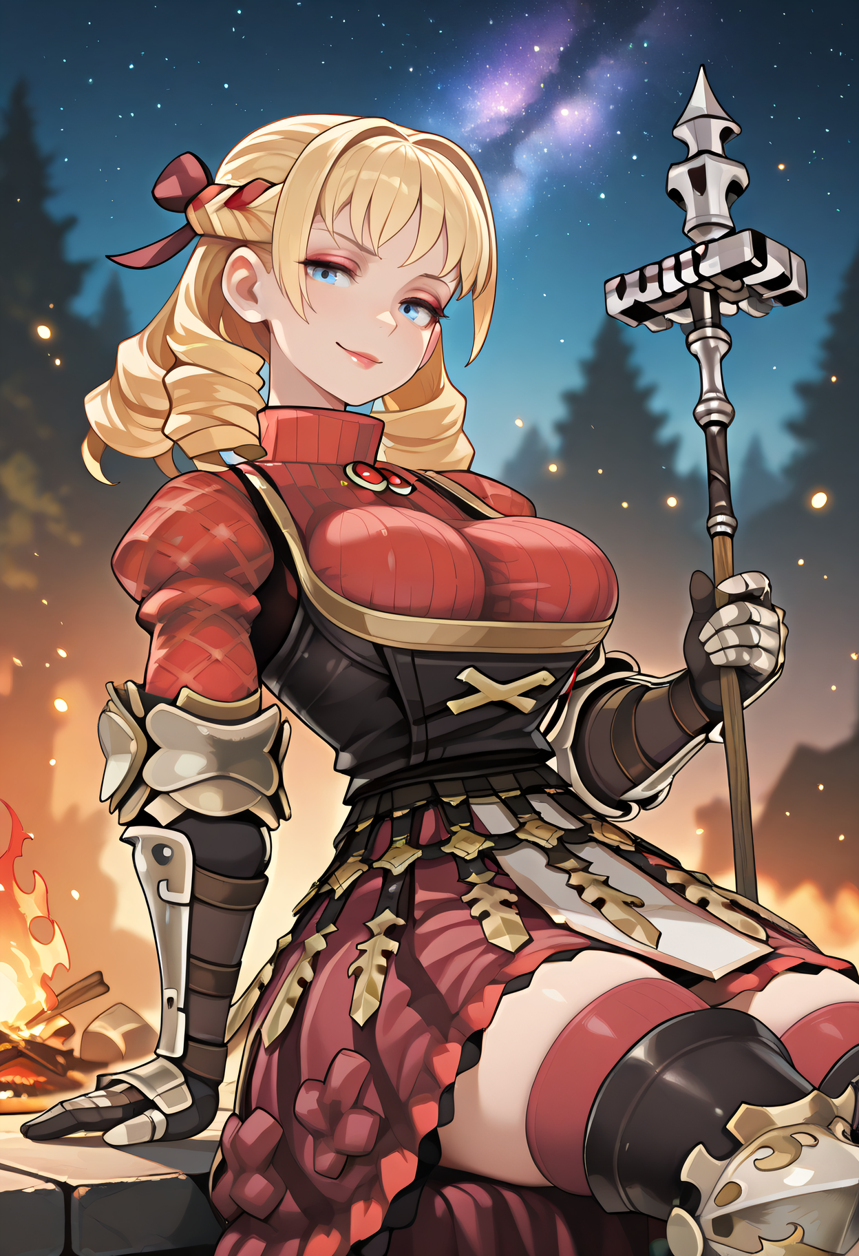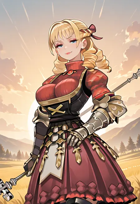 norbelle (unicorn overlord), 금발, 드릴 헤어, 파란 눈, 헤어 보우, 빨간 보우, 메이크업, 붉은 입술, 중간 크기의 가슴,