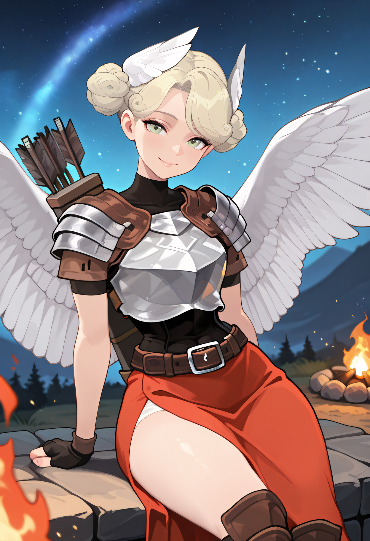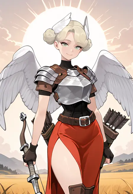 raenys (unicorn overlord), ブロンドの髪, 短い髪, 前髪, ダブルバング, 緑の瞳, 天使の翼, 白い翼, 羽根の翼,