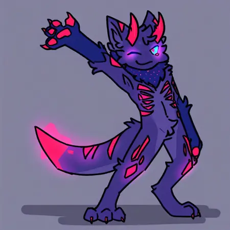| トレーニングワード | carneline, carneline kaiju paradiseコピーしました! purple skin, purple fur, red details, red markings, cyan sclera, red eyes, glowing eyes, horns, animal ears, furry, anthro, markings under eyes, fur collar, glowing fur collar, animal tail, glowing tail tip, claws, chest markingsコピーしました! |