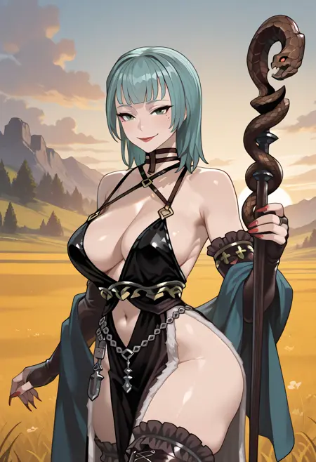 마녀 복장, 검은 목걸이, 노출된 옷, 어깨 노출, 분리된 소매, 네일아트, 팔꿈치 장갑, 모피 테두리, 가슴 선, 배꼽, 무릎 위 부츠, 긴 손톱, 날카로운 손톱, 빨간 손톱, 허벅지까지 오는 양말, 하이힐, 체인, 큰 가슴,