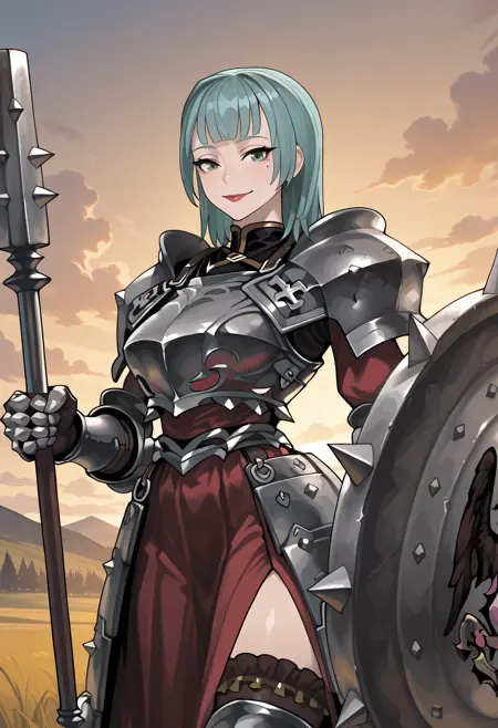 갑옷 복장, 빨간 드레스, 기사, 전체 갑옷, 가슴 보호판, 어깨 갑옷, 장갑, 빨간 치마, 날카로운 돌기,