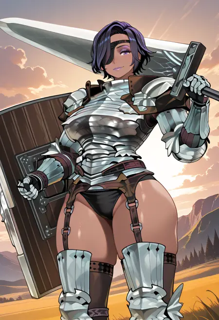 - amalia (unicorn overlord),短发,紫色头发,头发遮住一只眼睛,眼罩,紫色眼睛,妆容,口红,眼影,紫色嘴唇,深色皮肤,巨乳女性