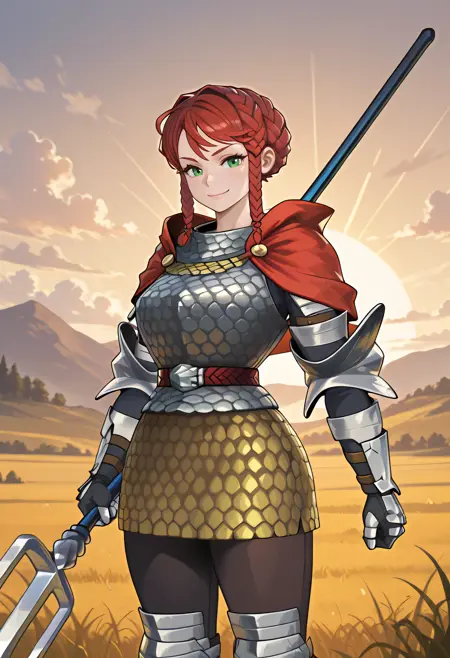 - 힐다 (유니콘 오버로드), 빨간 머리, 긴 머리, 두 줄 땋은 머리, 앞머리, 녹색 눈