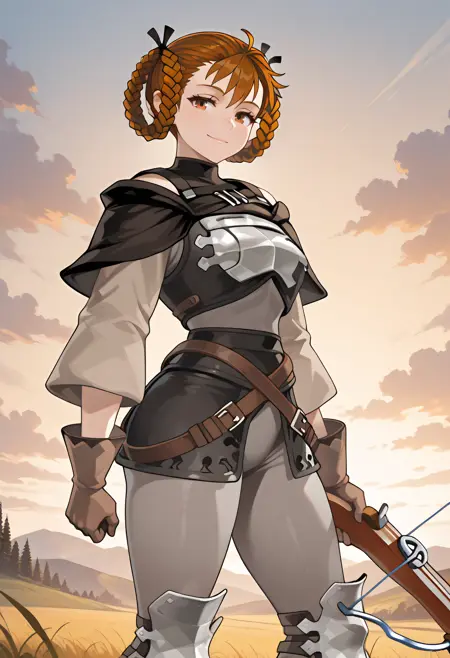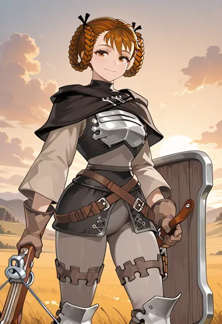 昇進衣装、鎧、胸当て、長袖、茶色の手袋、ズボン、膝当て、ベルト、ホルスター、クイバー、盾、