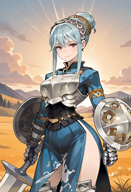 승진 복장, 금 장식, 보석, 갑옷, 어깨 갑옷, 팔던, 파란 드레스, 장갑, 흉갑, 갑옷 부츠, 정강이 보호대, 측면 슬릿, 골반 커튼,