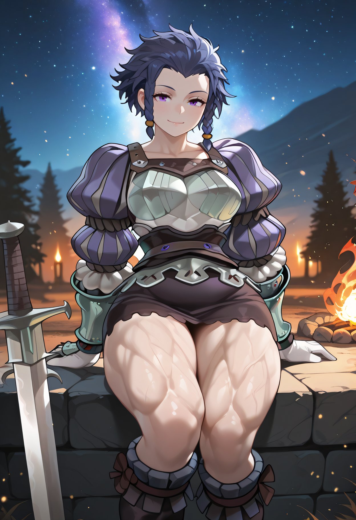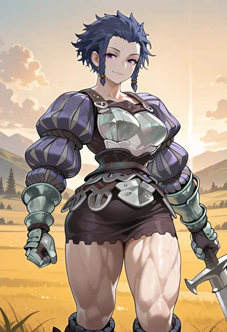berenice (unicorn overlord), 青髪, 短髪, 片方の編み込み, 紫色の目, 筋肉質な女性、