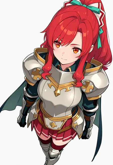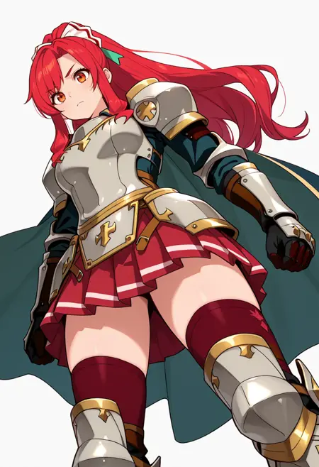 armor, breastplate, pauldrons, gauntlets, cape, red skirt, pleated skirt,thighhighs, zettai ryouiki, armored boots,