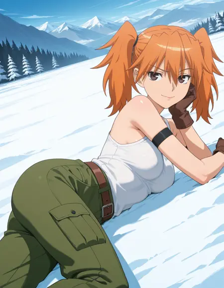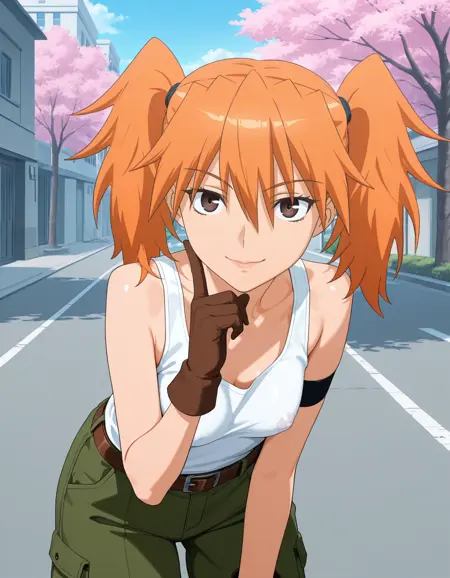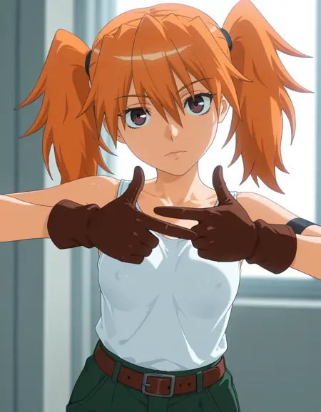 服装:オレンジ色の髪、ツインテール、目の間の髪、濃い茶色の目、細い唇、中程度の自然な胸、袖なしの白いタンクトップ、緑のルーズなズボン、ポーチ付きの茶色のベルト、茶色のレースアップブーツ、茶色の手袋、左肩の黒いアームバンド