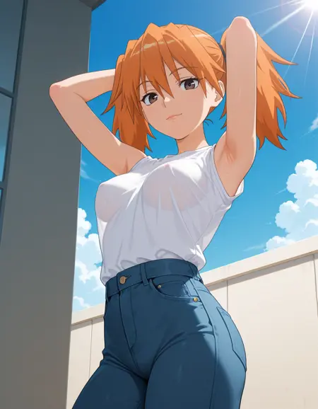 옷: 주황색 머리카락, 더블테일, 눈 사이의 머리카락, 진한 갈색 눈, 얇은 입술, 중간 크기의 자연스러운 가슴, 소매 없는 흰색 탱크탑, 녹색 느슨한 바지, 주머니가 달린 갈색 벨트, 갈색 끈 신발, 갈색 장갑, 왼쪽 어깨의 검은 팔밴드