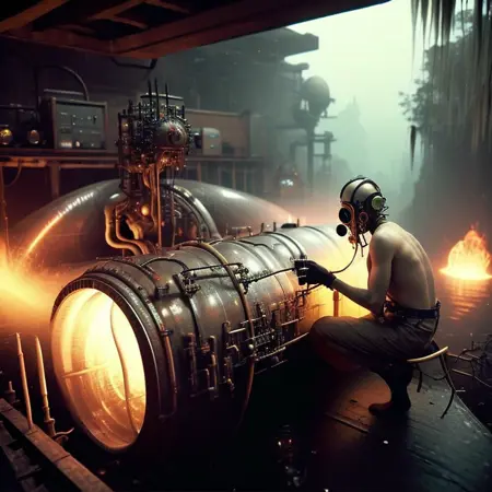 提示:“一张写实照片,展示一名热力技术员与冶金学家在路易斯安那沼泽的漂浮实验室中设计、测试与监控,((wireless_energy_displacement_tunnels))”