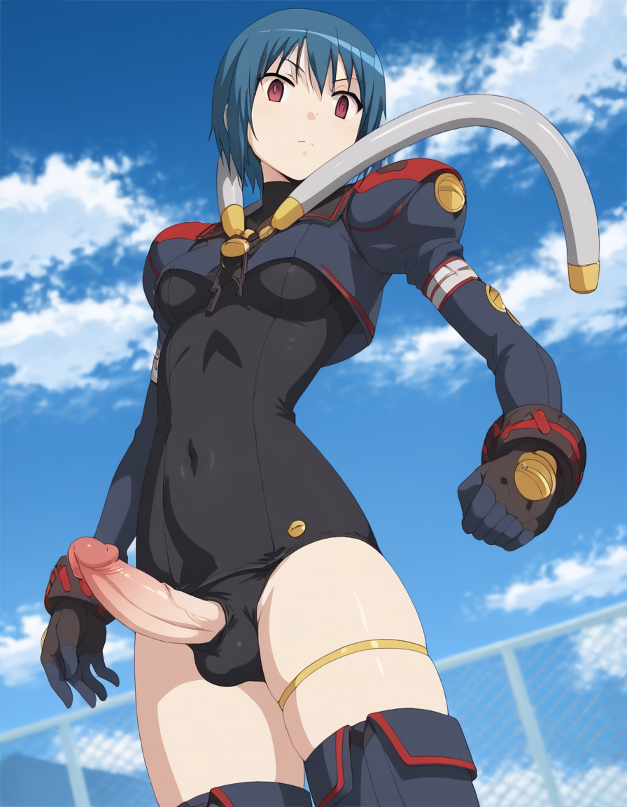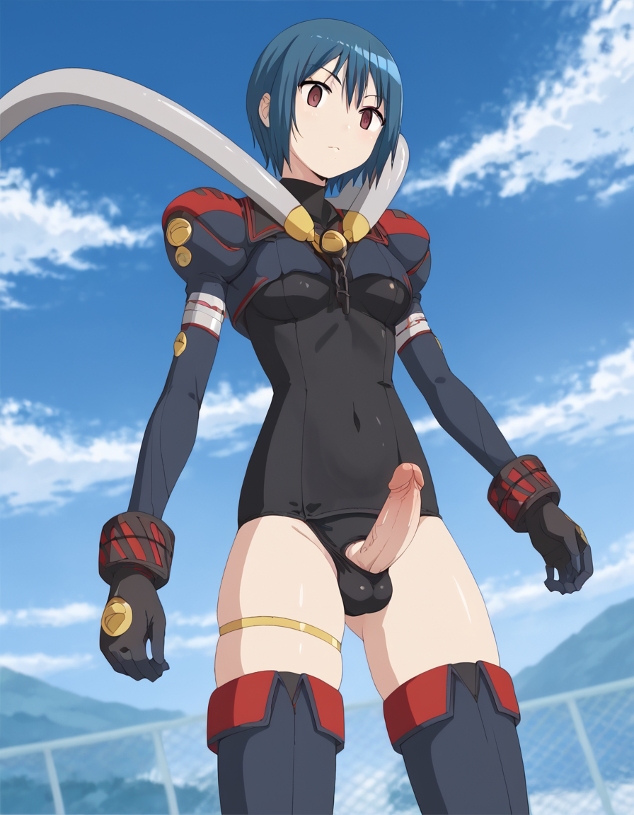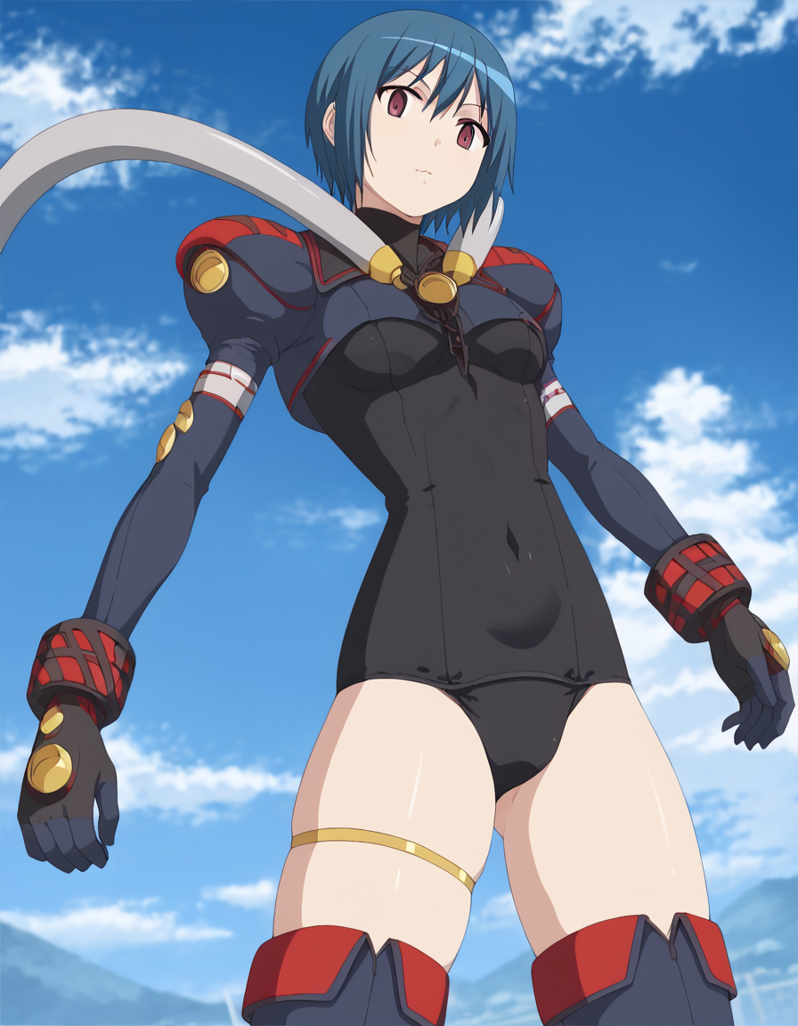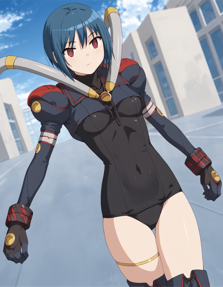 Her outfit blends elements of a bodysuit and school swimsuit, including a leotard-style one-piece, black gloves, thigh-high boots, and thigh accessories. Due to the detailed and layered design, some outfit components may have inconsistent reproducibility when using the LoRA.