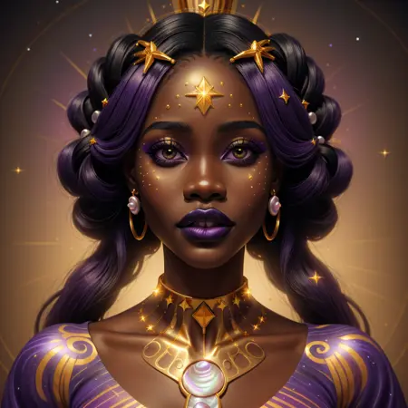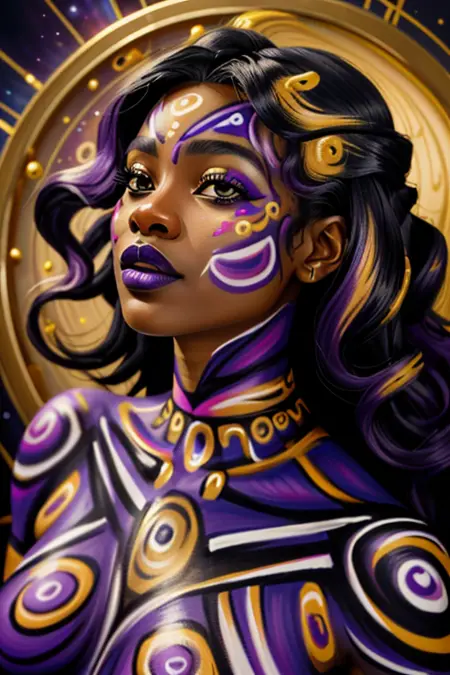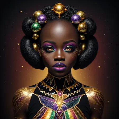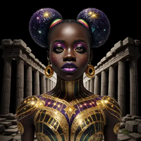 raw photo, masterpiece, (((chromatic))), Midshot of an African woman in royal armor with hints of gold, amber and black. ((rainbow sparkles)), Her hair, hair buns and afro puffs with diamonds and crystal orbs, complements her chromatic makeup and dark purple lips highlighted in gold. The ambiance captures the essence of 32k UHD colorful fantasy realism, standing in from of the ancient ruins of a monolithich temple, (wearing celestial cosmic themed bodypaint:.85), (wearing space armor:.15), high resolution, 8k, hasselblad, sfw, lora:tcg1:.95