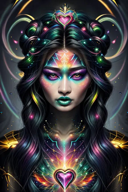"一位发色明亮的洋红色波浪长发的年轻女子,自信地摆出姿态,置身于未来主义环境中 🌆。她的身体绘有精美的彩色彩绘,由银、霓虹粉与钴蓝构成,营造出赛博外骨骼的幻象。 💠 她胸前醒目地闪耀着一颗发光的心形徽章,周围环绕着漩涡状的全息图案。她的下半身采用匹配的金属质感彩绘,与霓虹照明的环境无缝融合。妆容包含浓烈眼线、粉色腮红与金色唇彩,细微的彩虹光点强化了未来感。深色背景中发光的几何图案,为她夺目的存在增添了深度与对比。"
