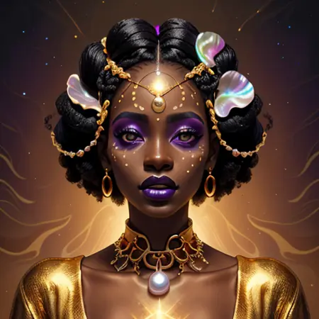 "一位黑发编成优雅发辫的女子自信伫立于金光沐浴的大理石长廊中 🌟。她的身体覆盖着金、青绿与紫罗兰色的彩色身体彩绘,宛如流动的盔甲,闪耀如母贝般光泽。 🐚 她胸前呈现一个发光的神圣之心图案,在苍白肌肤上柔和闪烁。盔甲延伸至双臂与肩部,饰有羽毛与鳞片般的精细纹路。她佩戴金色头冠,点缀全息效果,戏剧性妆容则包括金色唇彩与虹彩眼影,在光线下璀璨闪烁。"