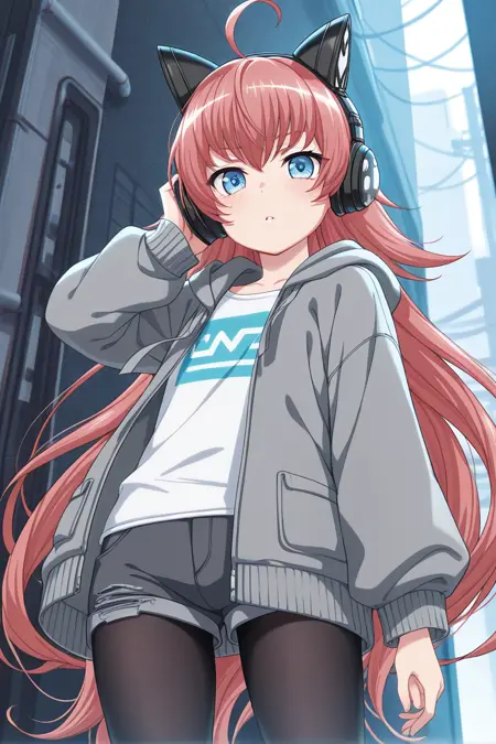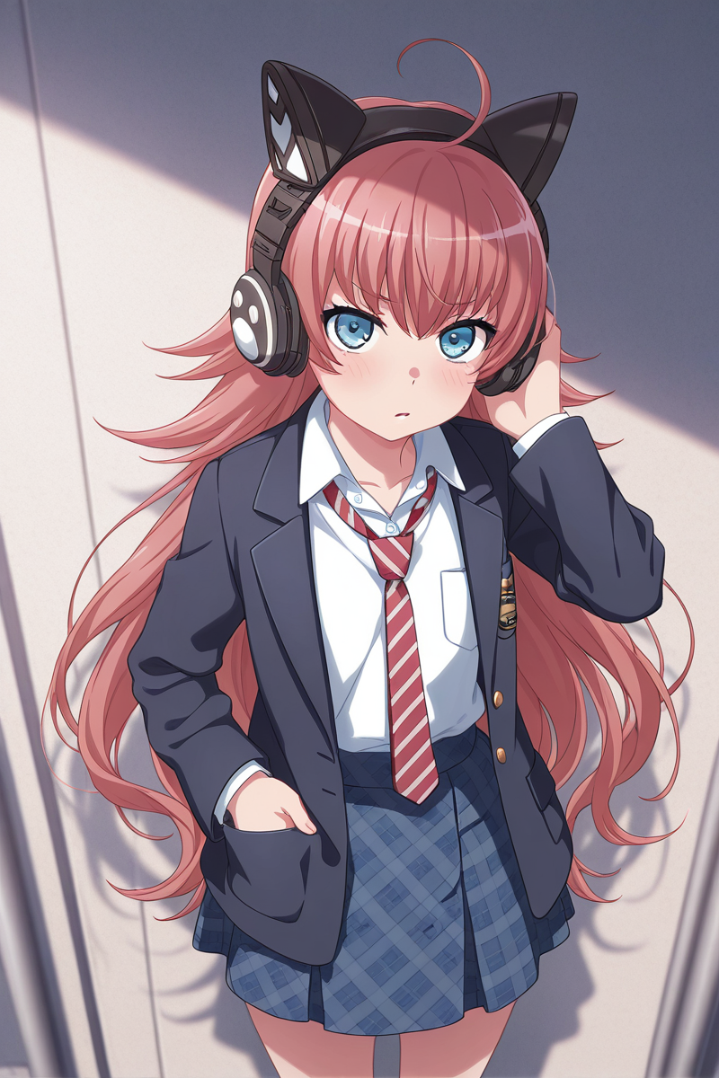tamadechiyu, 1girl, solo, long hair, cat ear headphones, headphones, skirt, necktie, ahoge, striped necktie, red hair, blue eyes, plaid skirt, school uniform, open jacket, striped, plaid, shirt, looking at viewer, very long hair, blazer, white shirt, pleated skirt, celosia school uniform
