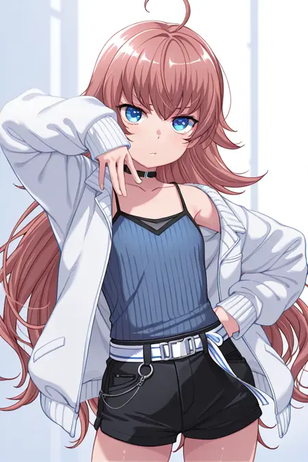 tamadechiyu, 1girl, solo, long hair, shorts, blue eyes, black shorts, ahoge, choker, shirt, belt, jacket, blue top, collarbone, white jacket, camisole, long sleeves, open clothes, short shorts, bangs, black rayon