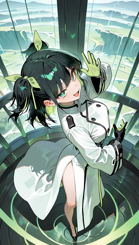黑色头发,霓虹绿色发带,两侧高束,露腿,长外套,高侧开叉,宽袖,手套,白色衣物,