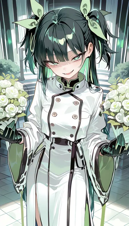black hair,neon green hair ribbon, two side up, exposed legs, long coat, high side slit, wide sleeves, gloves, white clothing,