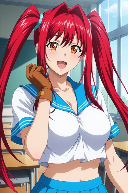 kanpei, long hair, red hair, twintails, hair ornament, hair intakes, wispy bangs, orange eyes, short sleeves, white shirt, blue sailor collar, cropped shirt, brown gloves, blue skirt, pleated skirt, white socks, loose socks, sneakers