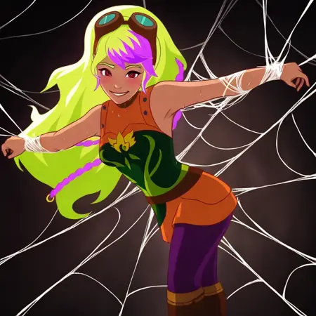 SiraCopperbranch, solo, multicolored hair, green hair, purple bangs, red eyes, light-skinned, long hair, ponytail, goggles, goggles on head,