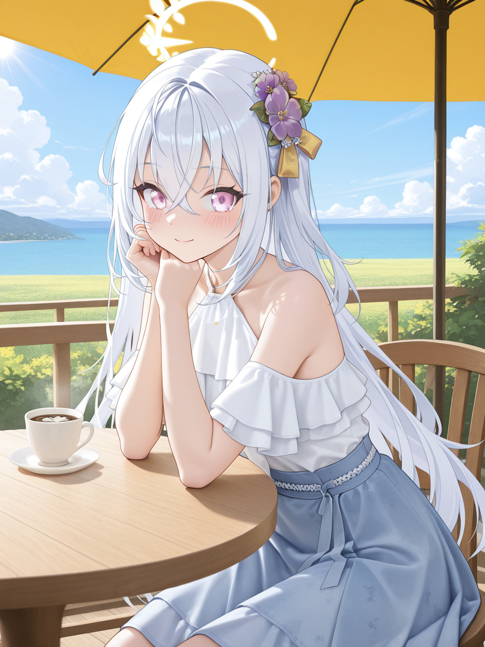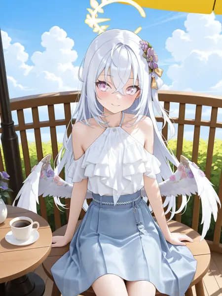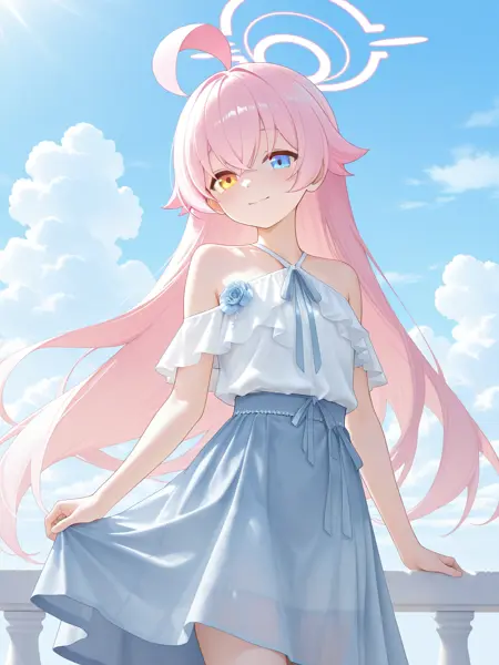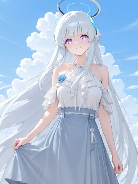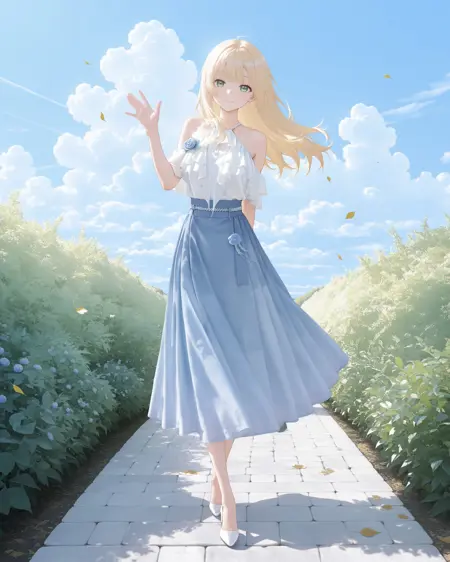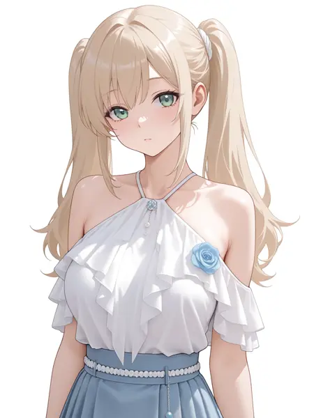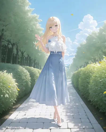 碎碎念环节:我大概是强迫症发作了,这件裙子的LoRA训练了五次,把我搞得精疲力尽。这一切都是因为那朵蓝色的胸花。第一次训练的时候,我并没有添加那朵胸花的提示词,我想它会被一并包含在上衣的特征里被学习。但我错了,不加提示词的情况下,那朵胸花就像被踩扁的口香糖一样,超难看,于是我试着添加“flower”来拯救胸花——胸花确实重新盛开了,但角色身边也难免开满了鲜花;我又试着添加“corsage”,这次终于没有花海了,但胸花却同时出现在了角色的胸部两侧......没办法我只能重新训练,但这就像开启了连锁反应,后面每一个重新训练的模型都有问题,要么胸花问题没有解决,要么是领口处多了镂空,要么二者同时存在.....总之折腾了五次,这应该就是最后的结果了,当然,胸花的问题都还在,只是发生的概率变小了,这大概就是生活吧,兜兜转转,终是殊途同归.....所以如果胸花生成的不对,那请多尝试几次吧.....
