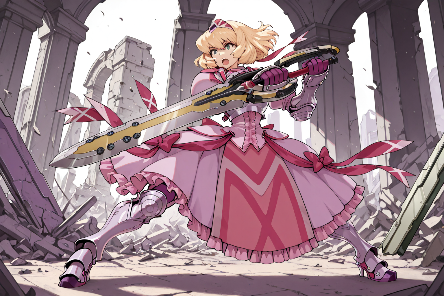 alexia1,armored_dress,dress_bow,breastplate,gauntlets,leg_armor,hair_ornament,ribbon,purple_gloves,blonde_hair,short_hair,