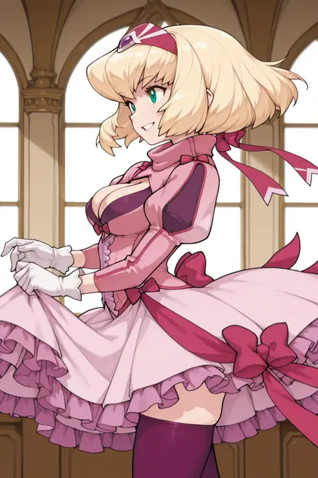 alexia3,frilled_dress,dress_bow,white_gloves,purple_legwear,footwear,cleavage_cutout,blonde_hair,short_hair,hair_ornament,ribbon,