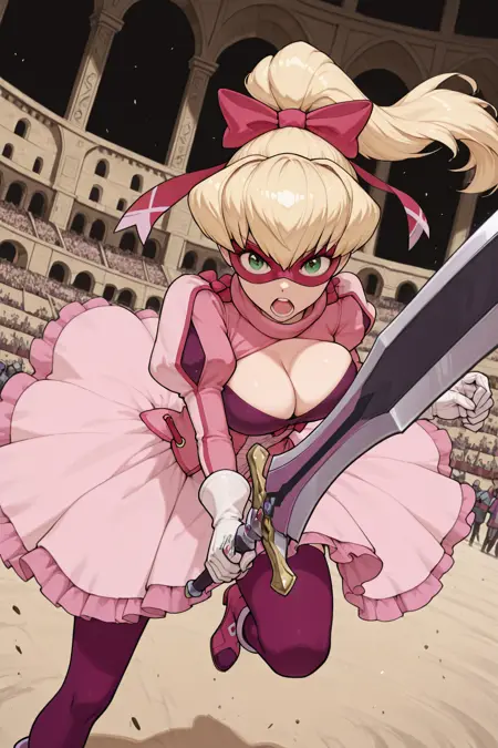 alexia4,pink_dress,white_gloves,purple_legwear,footwear,cleavage_cutout,blonde_hair,hair_bow,ponytail,domino_mask,