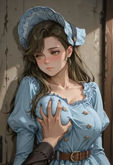 outfit_dress, blue dress, juliet sleeves, long sleeves, puffy sleeves, bonnet, buttons, belt,