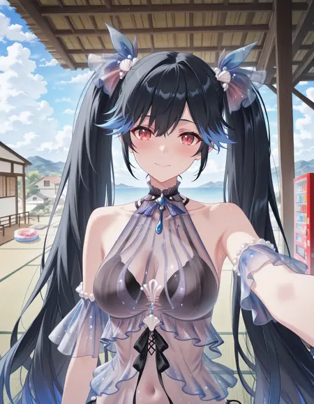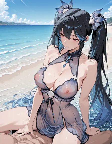 mai_lucia_lhfy, very_long_hair, twintails, bare_shoulders, ,black_hair,blue_hair, multicolored_hair,red eyes,  swimsuit, black_bra, see-through_dress, see-through, shell_hair_ornament, high_heels, black_footwear, sandals