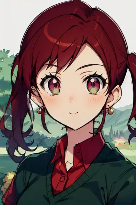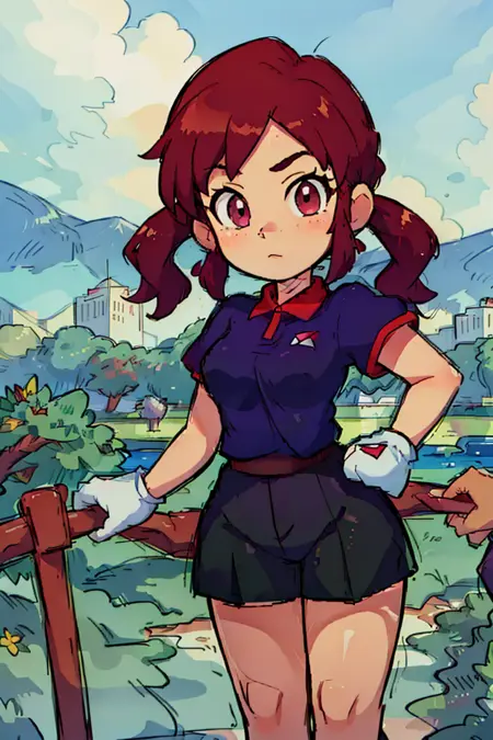 plum (mario golf 64), 1girl, solo, brown hair, pigtails, green eyes, smile, dark blue shirt, red collar, red cuffs, 1white_glove, black shorts, bare legs, socks, red and white sneakers,
