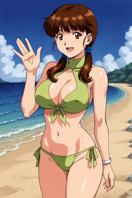 ViperRSRGirlB, 공식 스타일, 레트로 아트 스타일, 큰 가슴, 가슴이 드러난 녹색 민소매 앞쪽 매듭형 트러블넥, 팔찌, 가슴 선, 허리 부분,