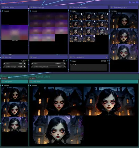 生成一个彩色潜变量,为其添加噪声,并通过不同曝光度生成变体,预览这些变体,选择你想要放大索引,然后完成,在两步内进行放大。
