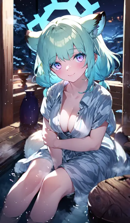 主なキーワードは:shigure_(\blue_archive\)、cyan_hairまたはaqua_hair、purple_eyes、short_hair、halo、bath_yukata、yukata、striped_yukata