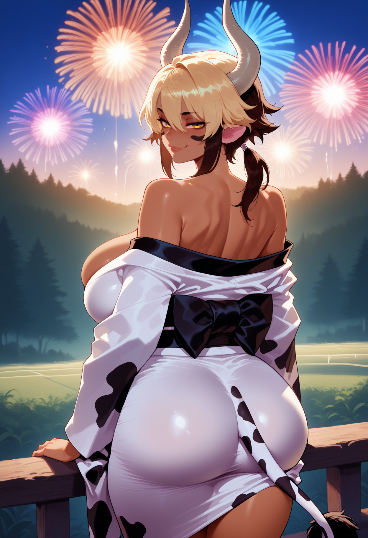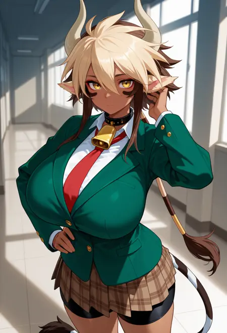 Appearance: dark-skinned female, facial mark, cow tail, body fur, brown fur, long hair, multicolored hair, brown hair, blonde hair, hair between eyes, low ponytail, animal ears, cow horns, yellow eyes, huge breasts