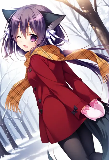 low twintails,red coat,orange scarf,plaid scarf,pink gloves,pink mittens,glove bow,pink bow,black pantyhose,