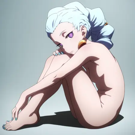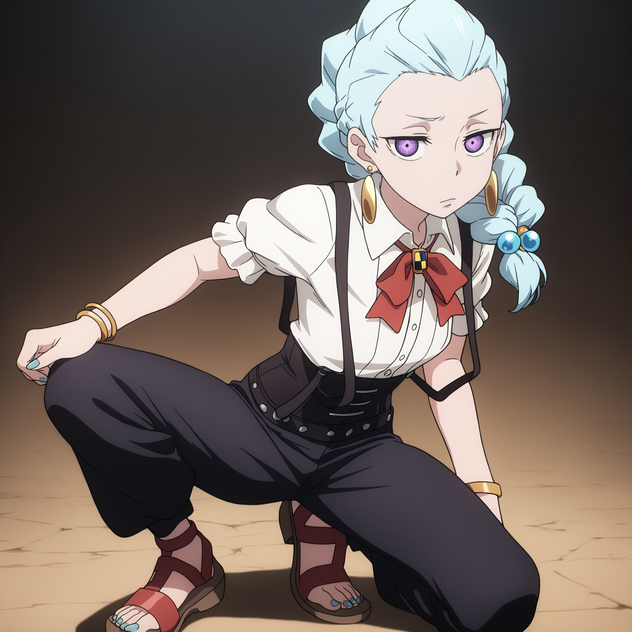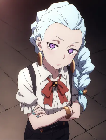 IL_Nona, 혼자, 1소녀, 연한 파란 머리, 긴 머리, 땋은 머리, 단일 땋은 머리, 머리 장식, 보라색 눈, 보석, 귀걸이
