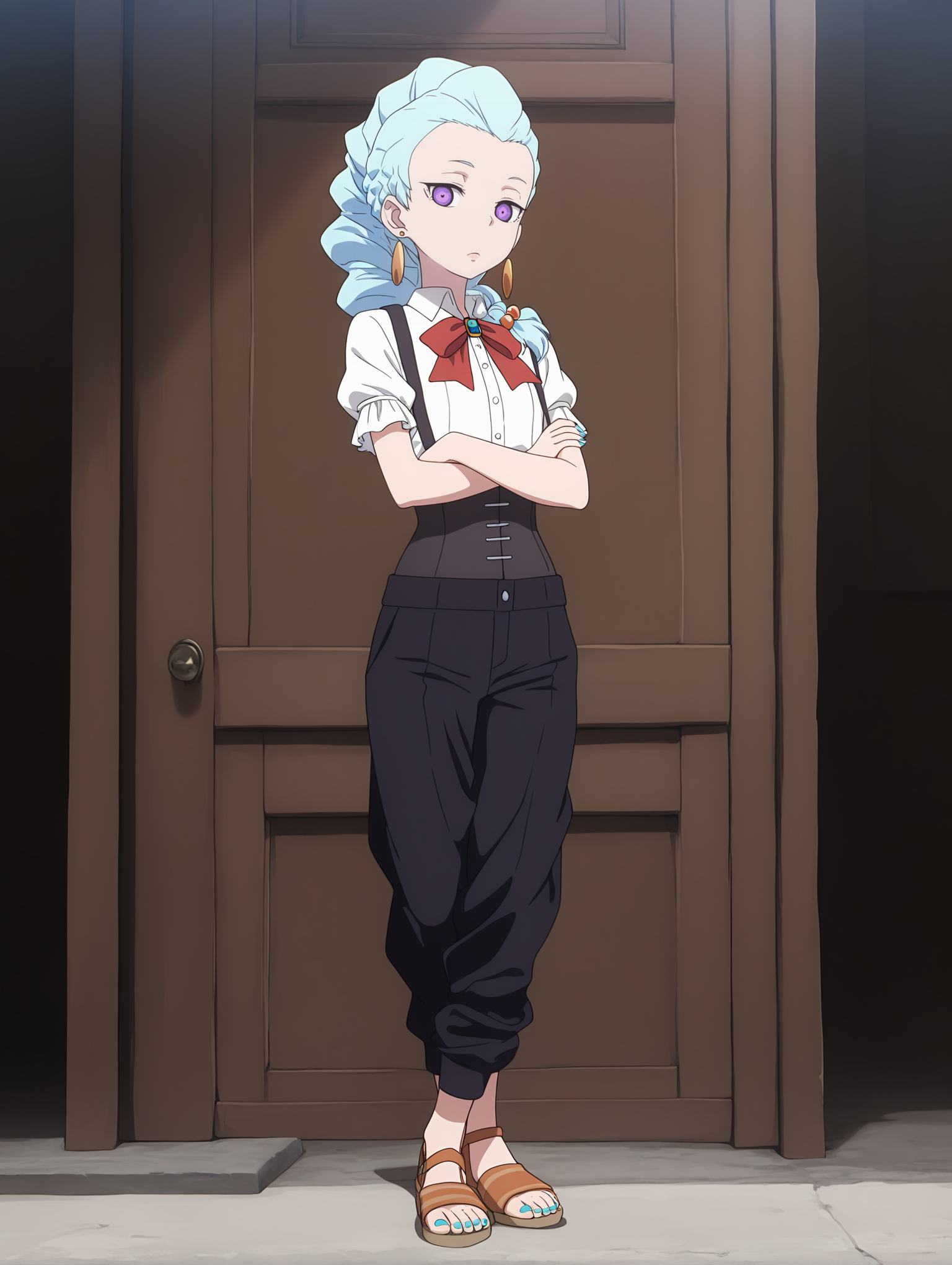 팔찌, 스uspenders, 셔츠, 흰 셔츠, 검은 바지, 칼라 셔츠, 빨간 리본, 빨간 넥타이, 퍼프 단축 팔, 검은 코셋, 검은 바지, 샌들