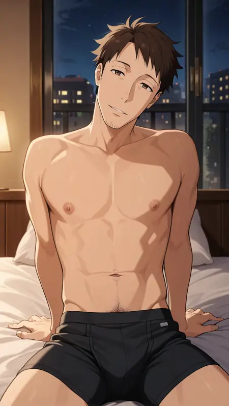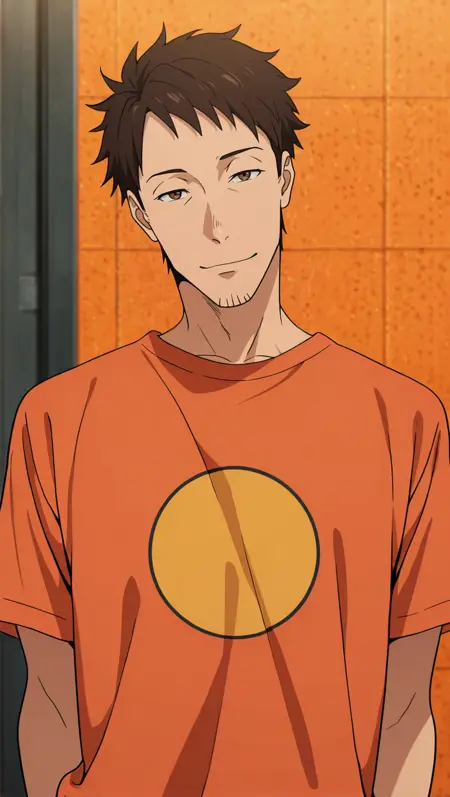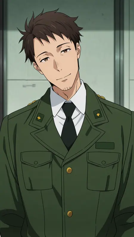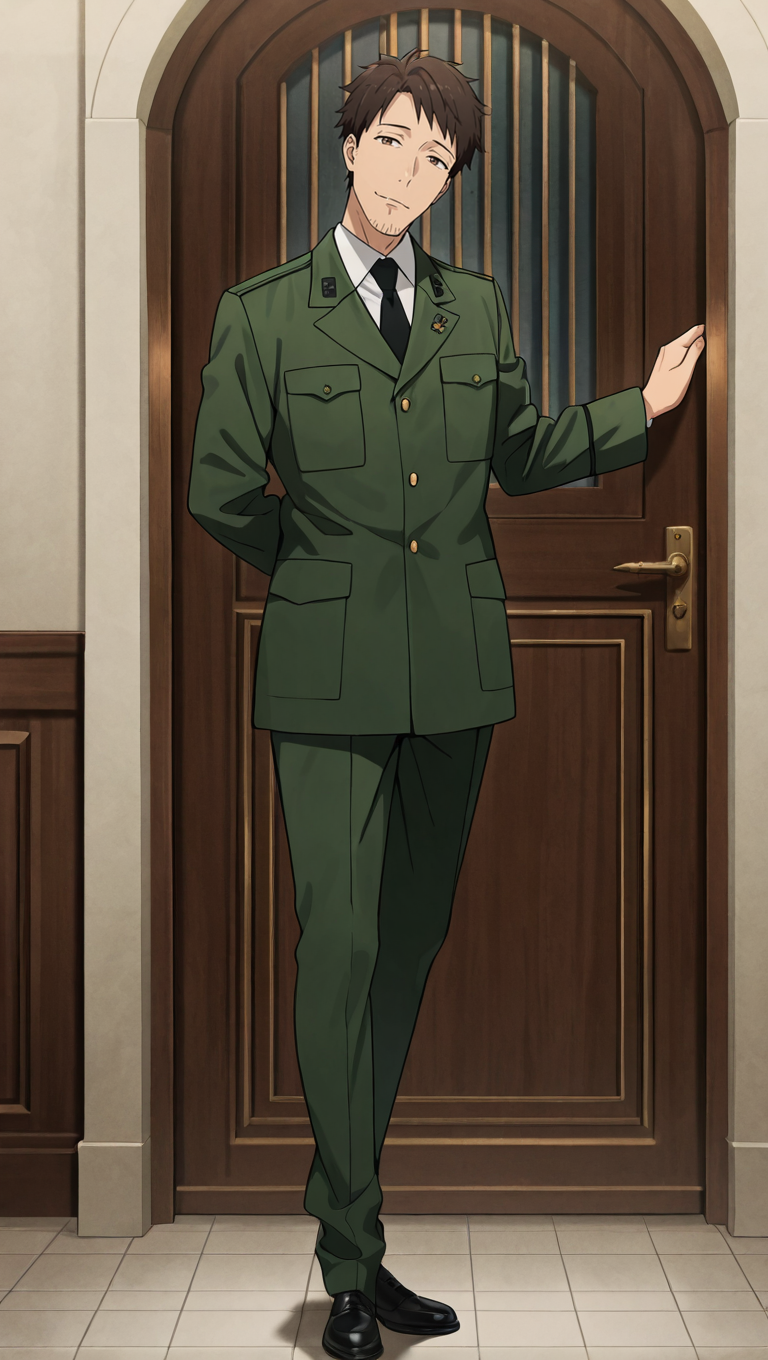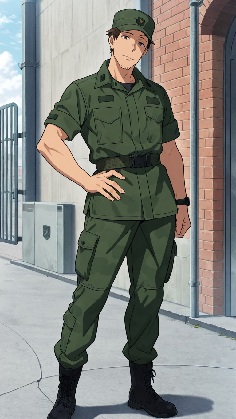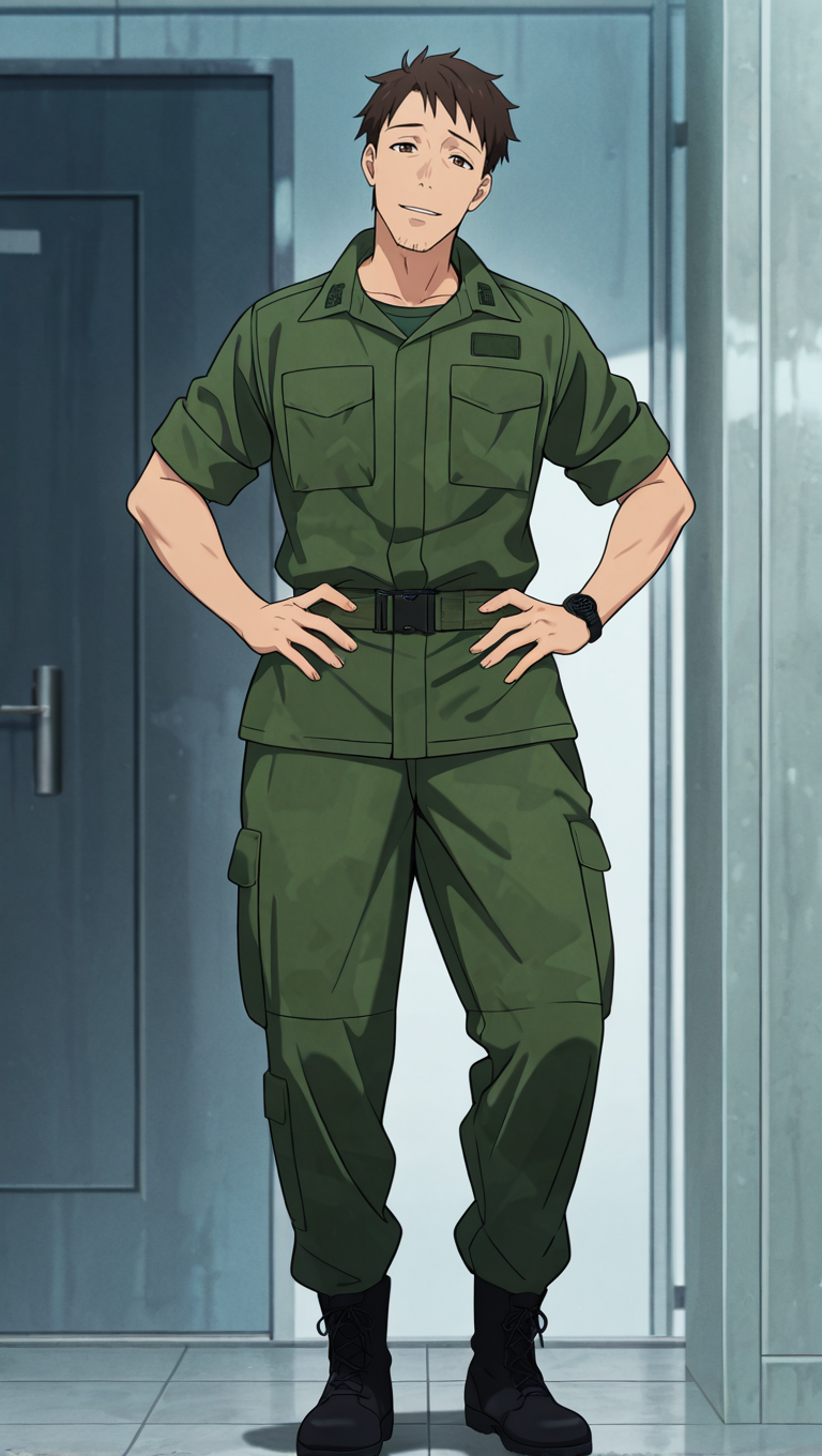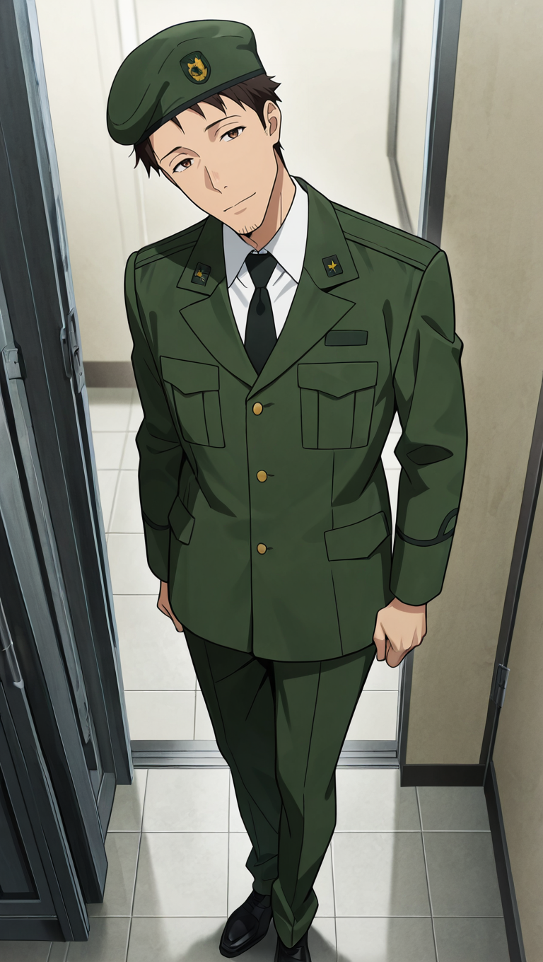 gate_itami, 1boy, adult male, brown hair, short hair, brown eyes, goatee stubble