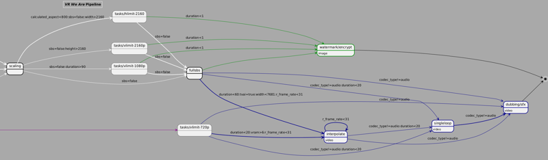 「VR we are」は、処理用にマルチメディアファイルを入力ファネル(ファイルフォルダ)に配置するのを待機します。デフォルトでは、ファイルは非線形パイプラインで処理され、出力バスケット(ファイルフォルダ)に到達します。パイプラインの各ステージはカスタマイズ可能であり、完全に無効化することもできます。